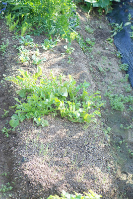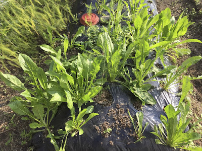 | この畝にも、防虫ネットは掛けていない。 奥から、リーフチコリー、ターツァイ、ルッコラの葉野菜が植えてある。 そして、一番手前には玉ねぎの種からたくさんの芽が出ている。 |