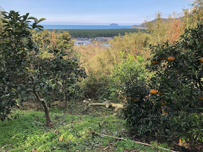 写っているのは、最近大きくなりすぎて、ミカンの木が日陰になるようになった雑木。