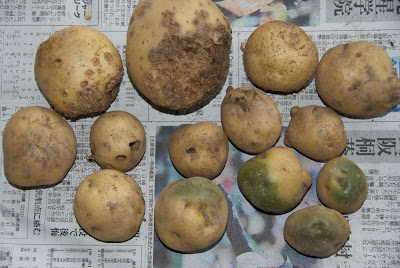 さて、最初の5本の収穫の時は、病気の芋、緑化芋はなかったが、今回は下の写真のように数は少ないが病気の芋、緑化があった。