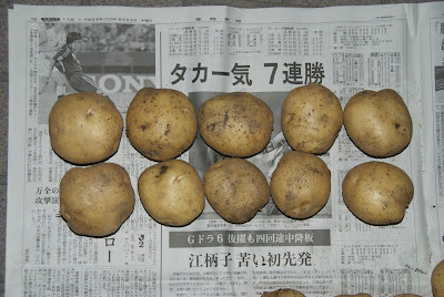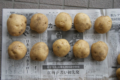 その収穫した男爵芋、今日やっと家に持ち帰ったので、新聞紙の上に並べてみた。