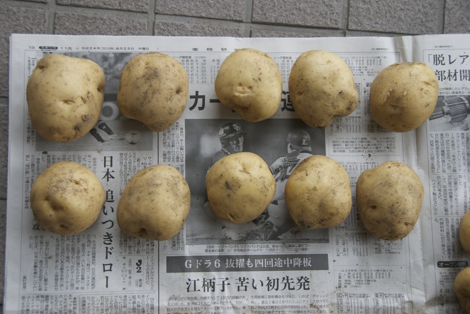 その収穫した男爵芋、今日やっと家に持ち帰ったので、新聞紙の上に並べてみた。