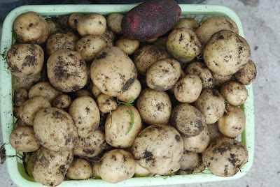 | これが最終的に収穫した男爵芋。今回の収穫は15本くらいだったと思われる。 紛れ込んだ1個のデストロイヤー、茎葉の状態からするとこの時期にしては芋は大きい。 |