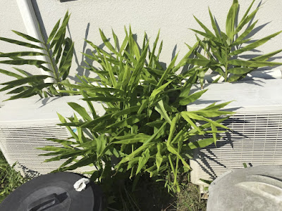 | ここでも元気よく成長し、大きなミョウガが収穫できる。 室外機の裏にもミョウガの苗が広がりつつある。 |
