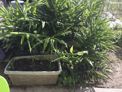| プランターの下からもニョキニョキ、ミョウガのその花が見える。 この辺り一帯にはミョウガの根茎が広がっているのだろう。 |