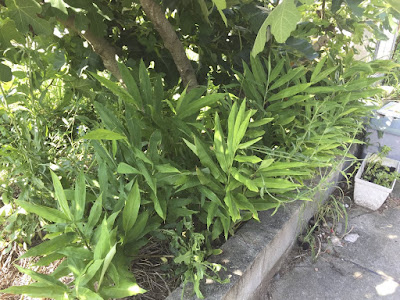 | ここが我が家で最大のミョウガ畑だ。 プランターに育てていたミョウガを移植した時に落ちて自然に増殖したものだ。 |