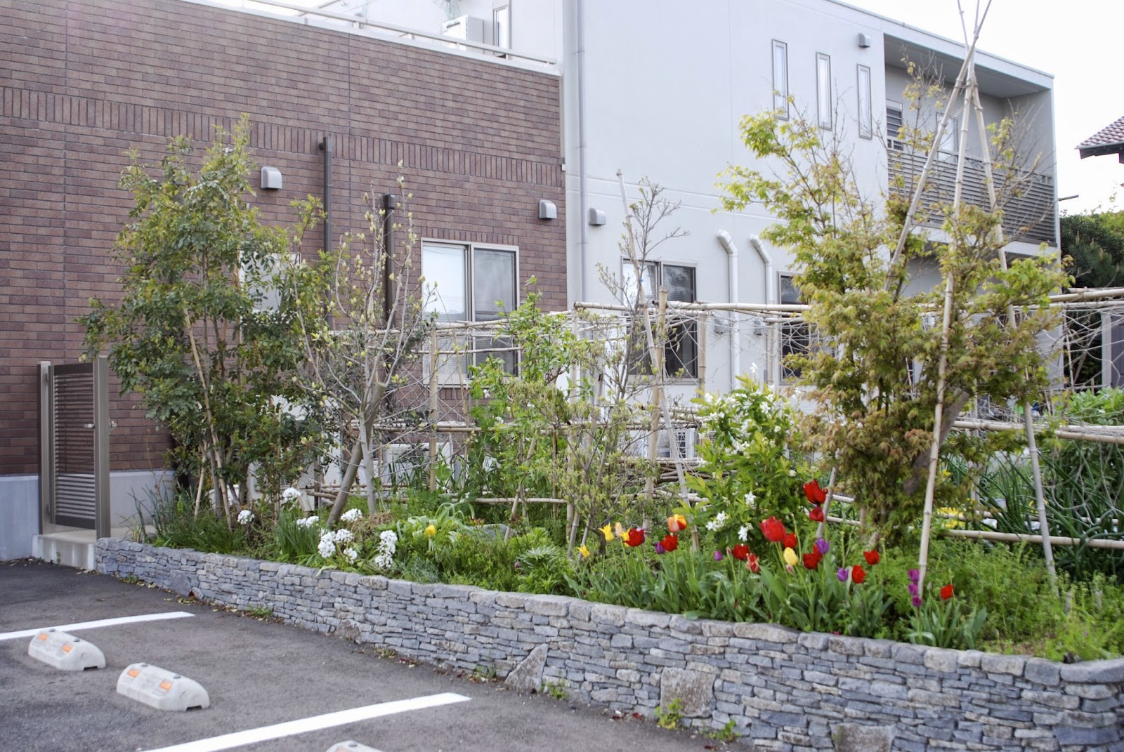 最初植えた4本の木は、左からシマトネリコ、黄色モクレン、ヤマボウシ、そしてイロハモミジだ。