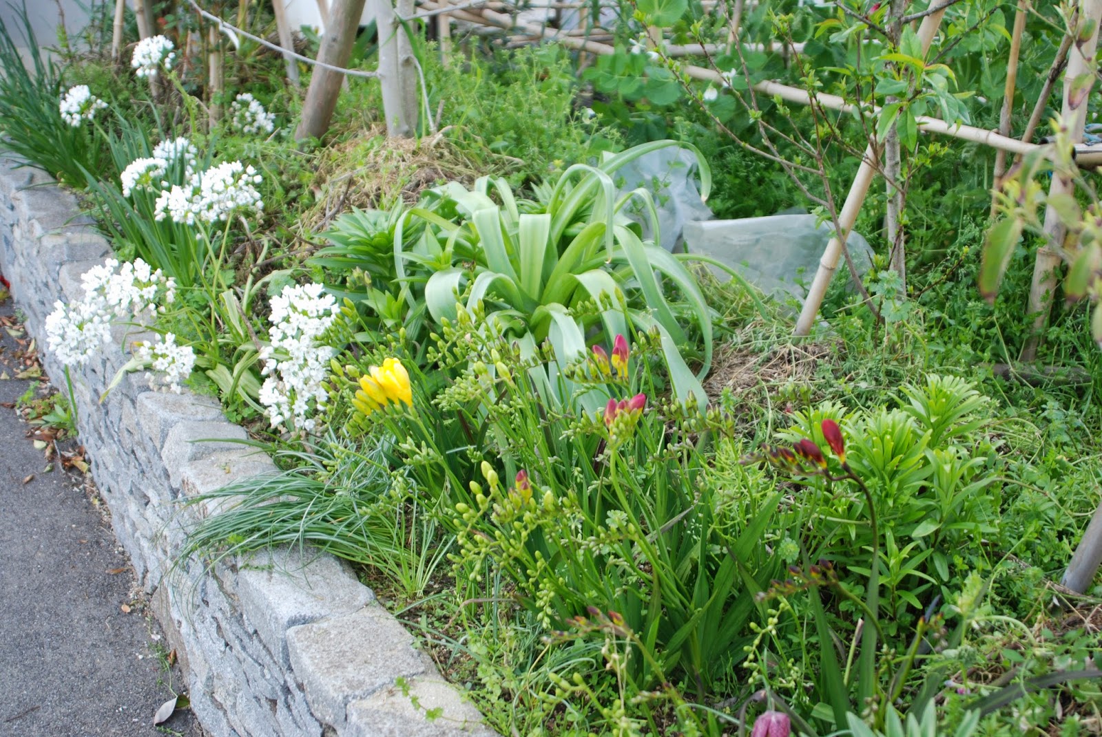 これらの小さな木と足下にある元気な花達、さらに雑草の協力もあり、この場所の目的の一つ、“目隠し効果”は少しは理想に近づいている。