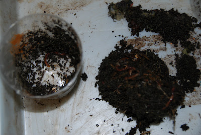 内容をひっくり返してみるとみみず君は極めて元気。投入した青年大人20匹に加え,赤ちゃんが7匹いた。ベッドに卵が含まれていたのだろう。やはりこの時期は孵化のシーズンだ。
