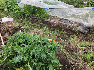 ミズナを収穫した場所では、短くした防虫ネットの上に他の場所と同様の方法で100円ショップの不織布を固定した。