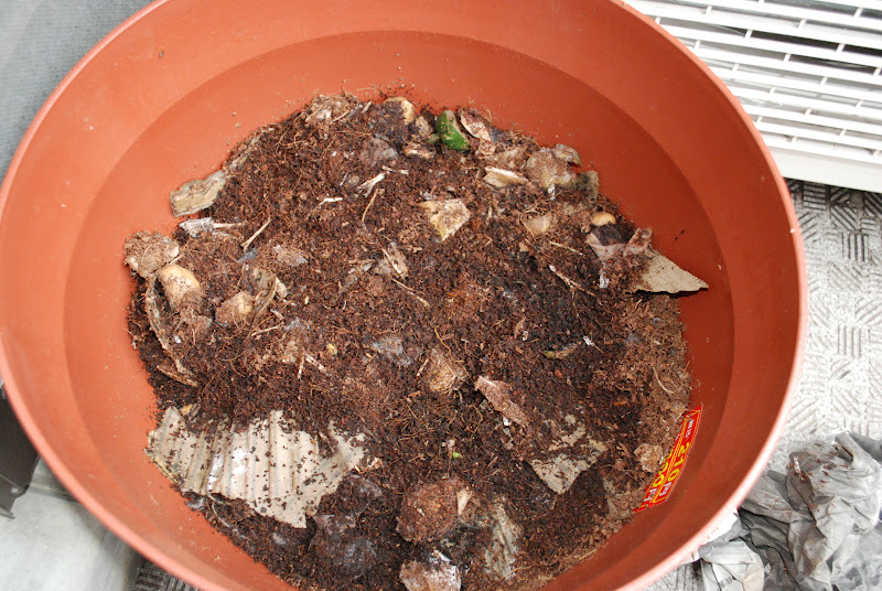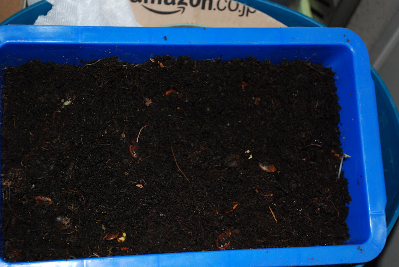 さて、こちらがこちらがアルコール臭の漂う餌とそれを入れていたココナッツ繊維を集めたもの、どんぶり型プランターに入れた。