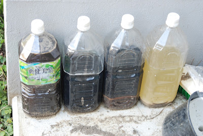 写真右端はブログの説明通り、ペットボトルに1cm強の油かすを入れ、その上に取り置いた水を入れていた。