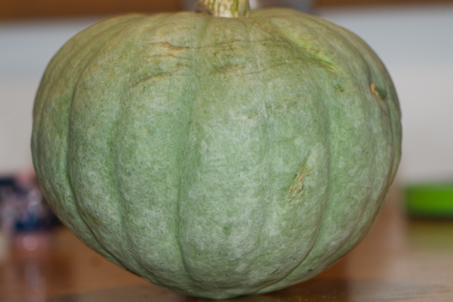 | これが貫禄のある3.3kgの白カボチャ。 えびすカボチャにも似ているが若干栗カボチャにも似ている。 収穫した他の白カボチャはお裾分け。このカボチャだけを我が家用に残している。 |