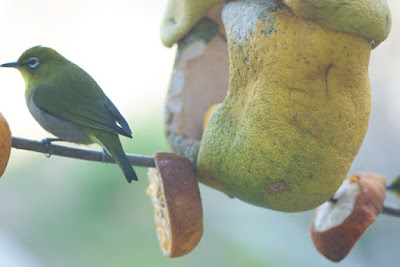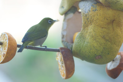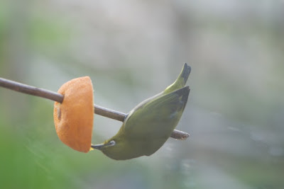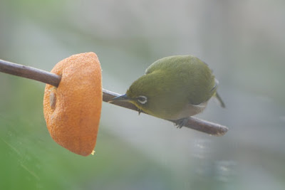 それでも、天気がいいとメジロ君たちの来訪機会が増え、仕事場のデスクから窓ガラス越しに楽しく眺めている。