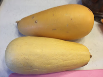 | 上の少し茶色かかった方は種取り用に保存していた最後の白ズッキーニ。 下の少しシワが入り始めたものは、食用として収穫して食べないまま置かれたもの。 |