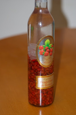 | 丁度、以前イチゴ酒が入っていた瓶が空いていたので、その瓶に入れた。 酒は焼酎を使っている。 |