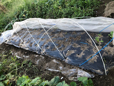 この畝を設置して1時間、早速小さなコオロギが数匹、防虫ネットの外側を飛び跳ねていた。