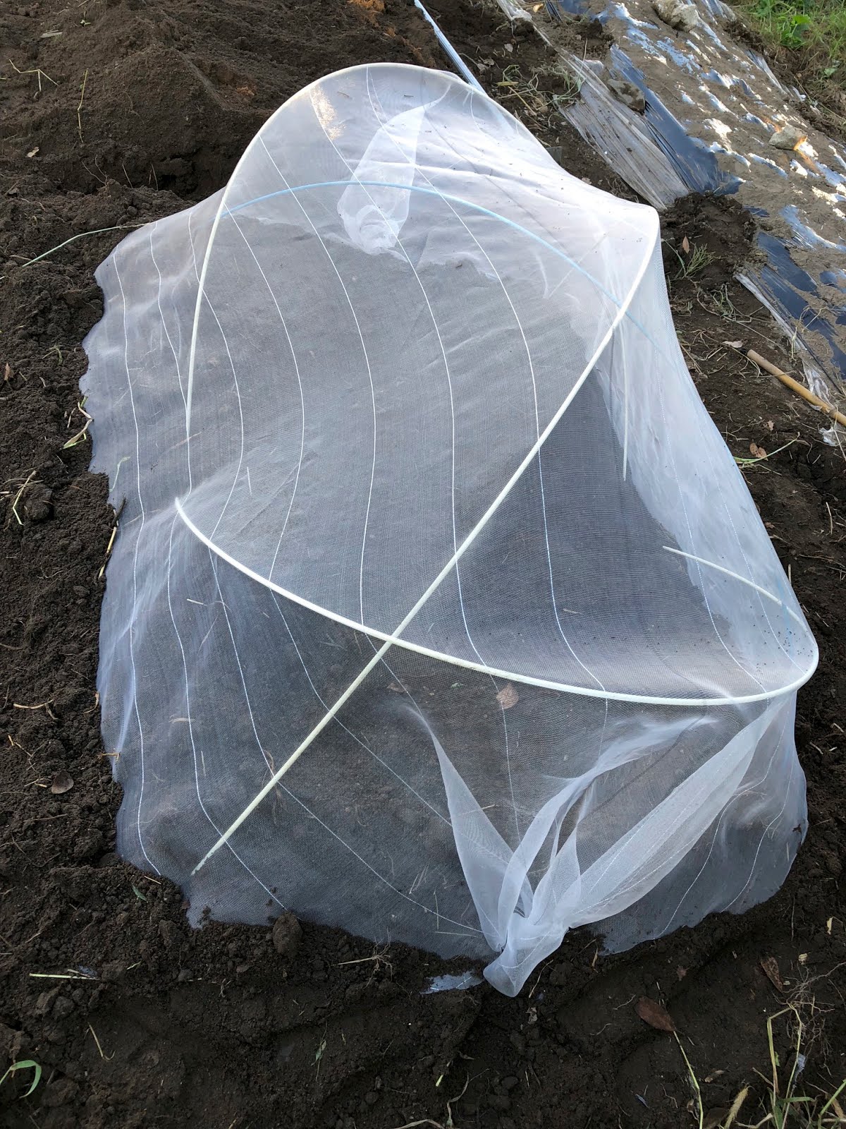 この畝を設置して1時間、早速小さなコオロギが数匹、防虫ネットの外側を飛び跳ねていた。