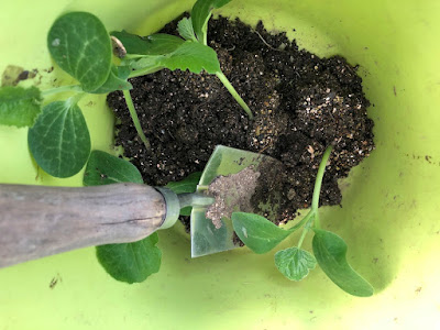 | こちらは3週間前にプランターに種をまいて、2週間前に出てきたズッキーニの芽。 10日前、本葉が出始めた頃に畝に移植するため容器に入れているところ。 |