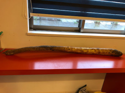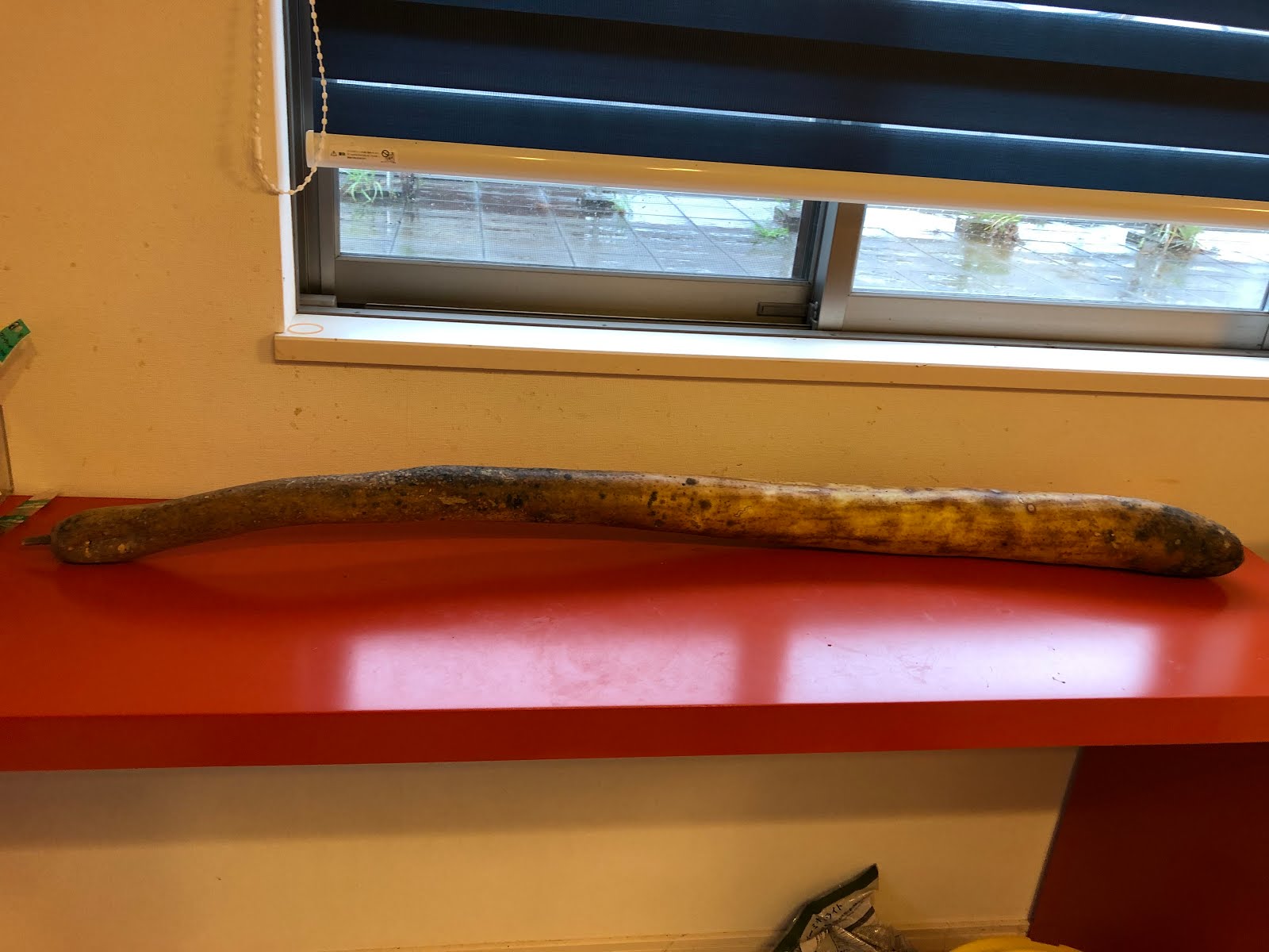| こちらは室内で乾燥させていた120cmの長いズッキーニ。 残念ながら、腐れるサインが少し出てきたので、室外に引っ越し。 オブジェになれるか、ゴミになるか微妙な状態になってきた。 |