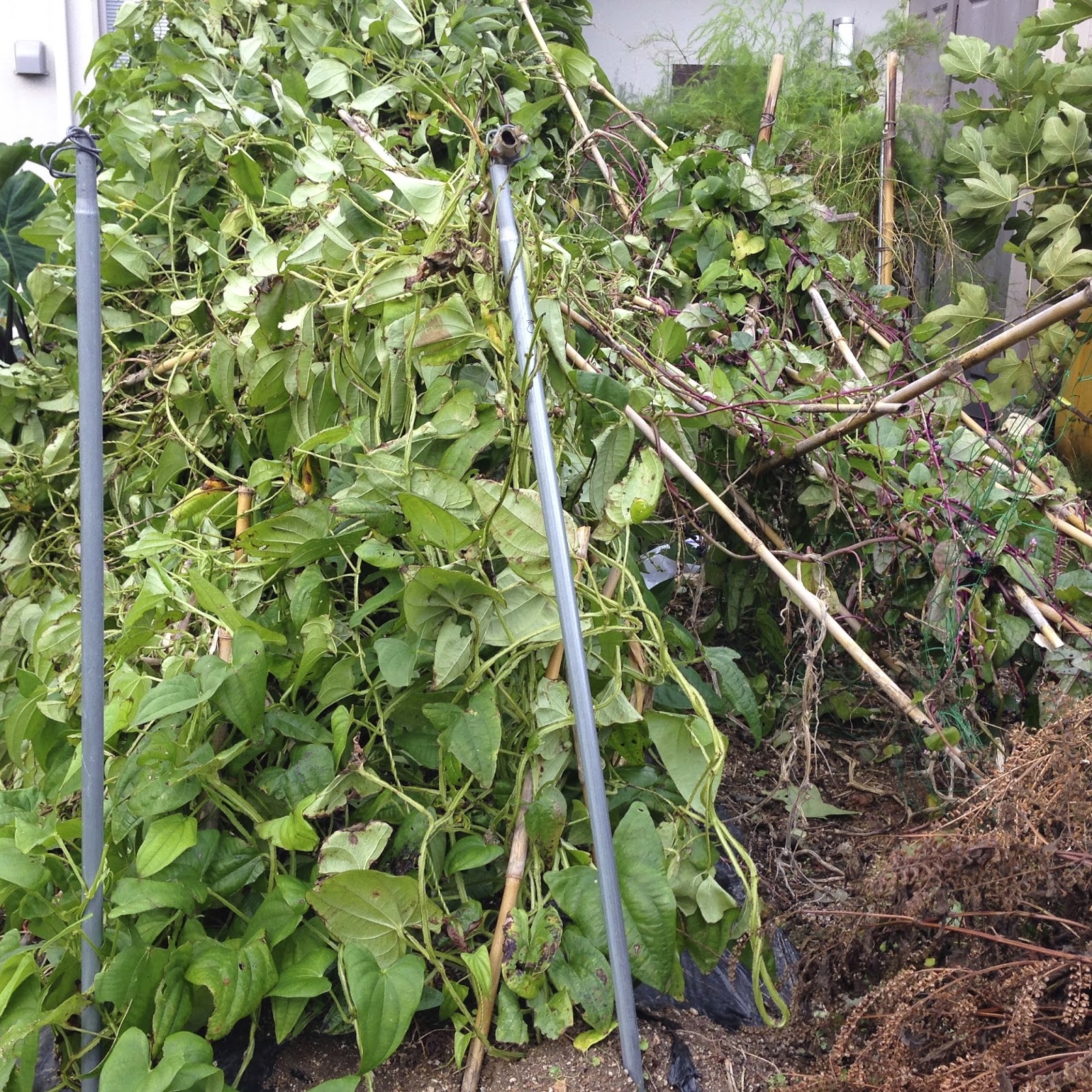 ただ、ツルムラサキはもうすぐ撤収だし、ツクネ芋もこの状態で芋の出来に影響はなさそうだ。今のところ収穫まで片付けはしない方針でいこう。