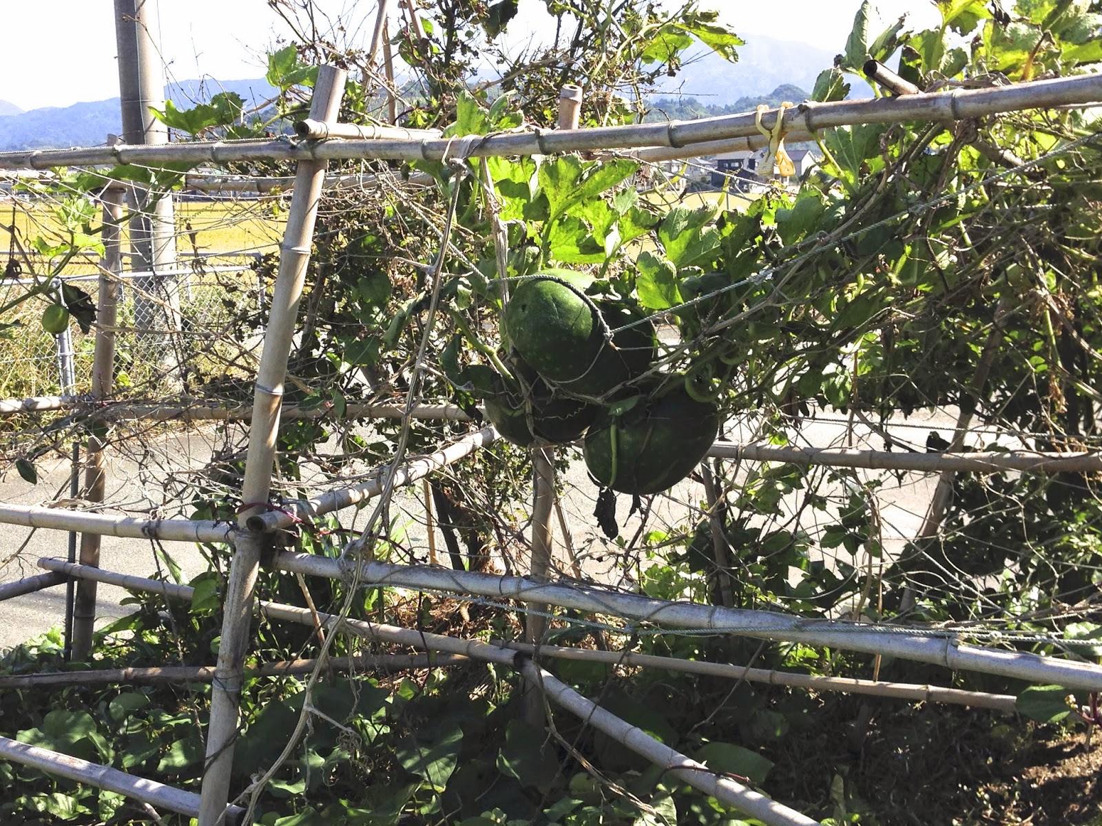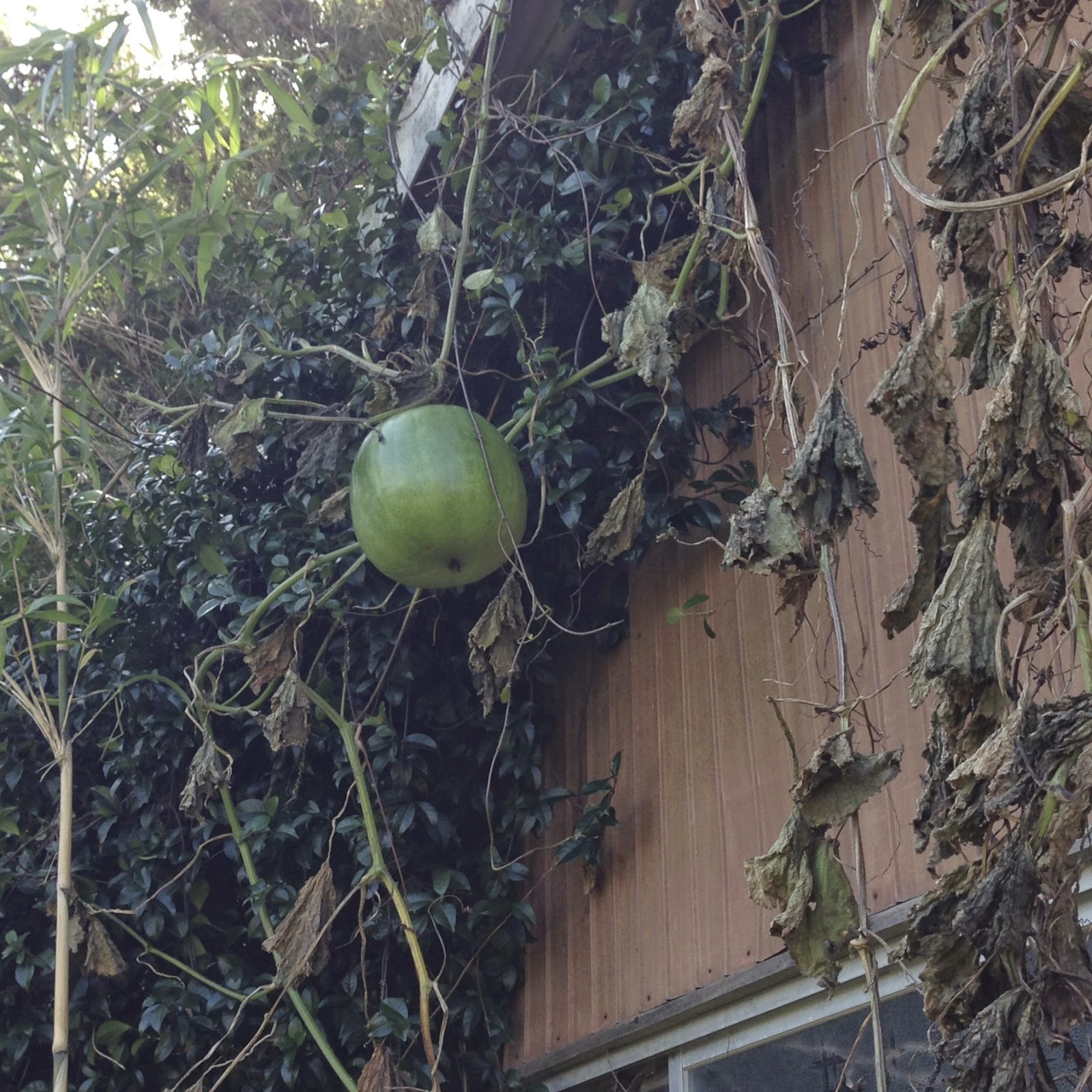 | 冬瓜の蔓は思ったより強度があるのだ。 今年の冬瓜、あちこちに出来過ぎた。今なっている分はどうやらミミズ君の餌になるかも。 |