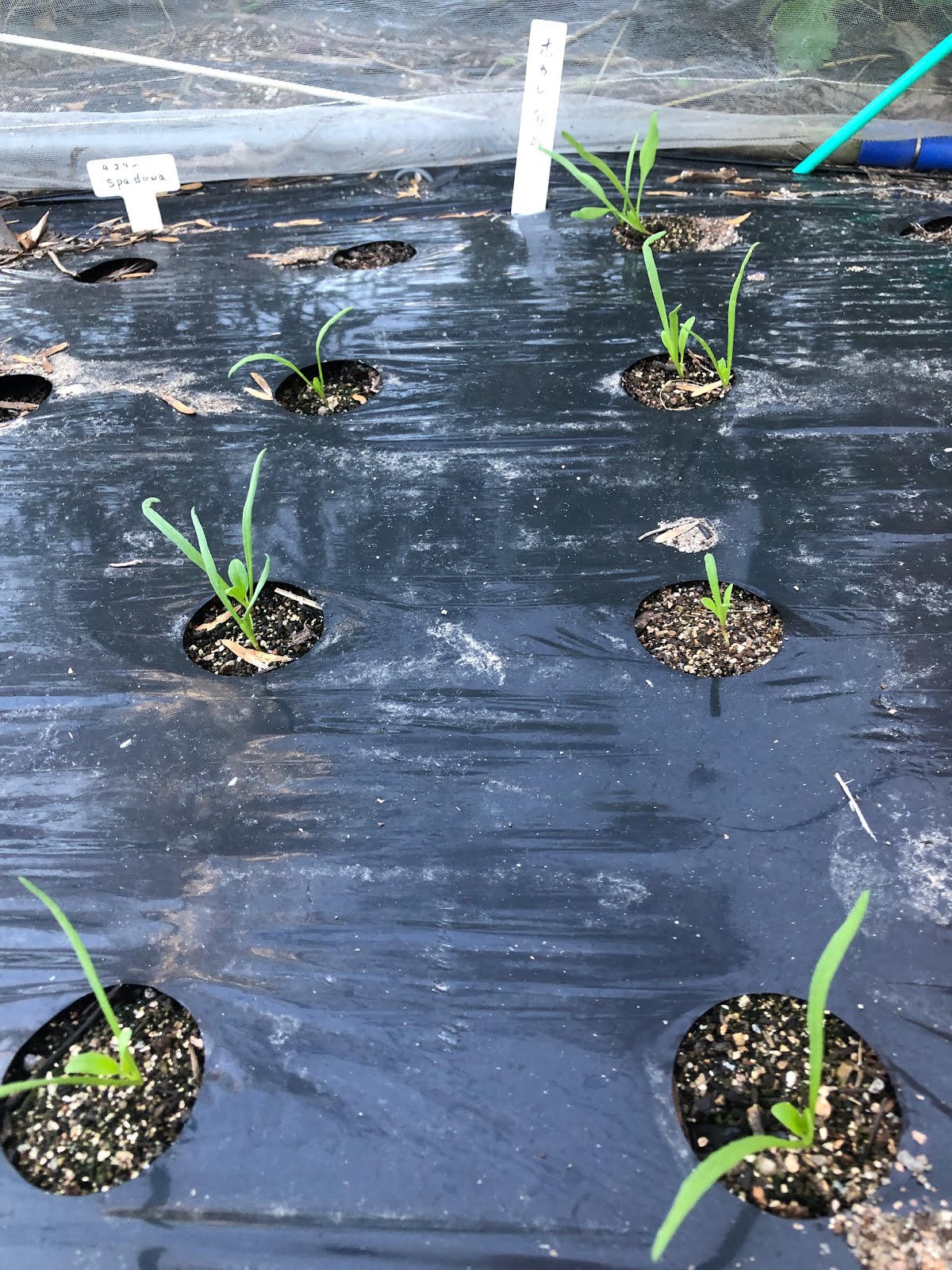 最初に種まきした畝では、新たにマルチを掛けて植穴に育つ芽をそのまま収穫しようと思っている。