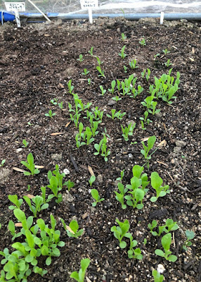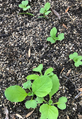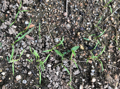 2番目の畝に出てきている多くの芽は少し大きな苗になったころ、本来の畝に移植していく予定だ。