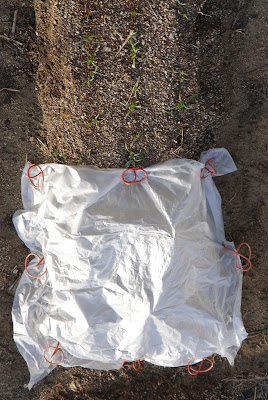| 風で吹き飛ばないように3方向に土をかけておいた。 僅かな時間で何となくシートが潰れてきているように思える。 やっぱりシートを浮かせるための処置がいるのかな? |