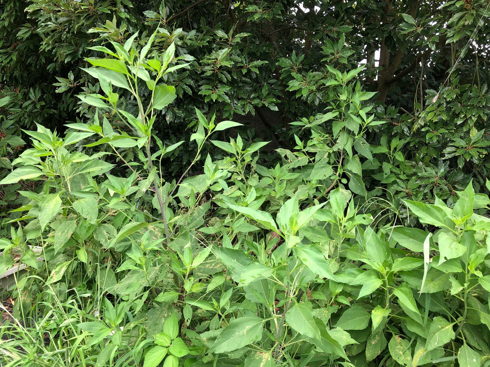 | 木の陰は薄暗い半日陰。 さらに、手前には高く茂ったキクイモがあるので周りの熱を防いでくれる。 |