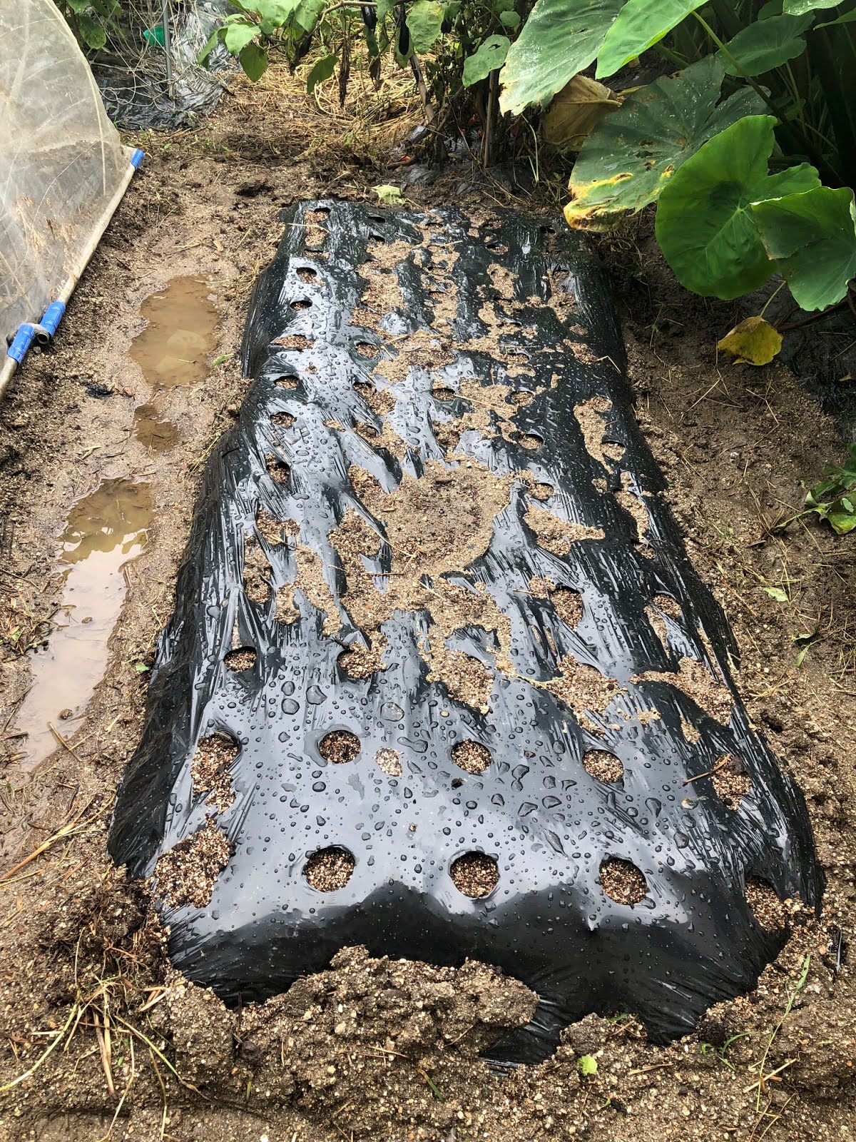 | 今日も午前中はしっかり雨になった。 この畝では種を直まきにした。 |