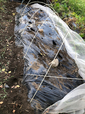 | こちらは種まきが終わって、マルチをかけ終わった畝。 こんな感じで、種を蒔いたり苗を植えたりすると雑草が片付いて気持ちいい。 |