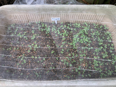 | 蒔いた種がちょっと多過ぎたかな? 出てきた芽が密集し過ぎで、これでは早めの移植が必要になるかも? 今のところ、このプランターの中では虫被害はなさそう。 |