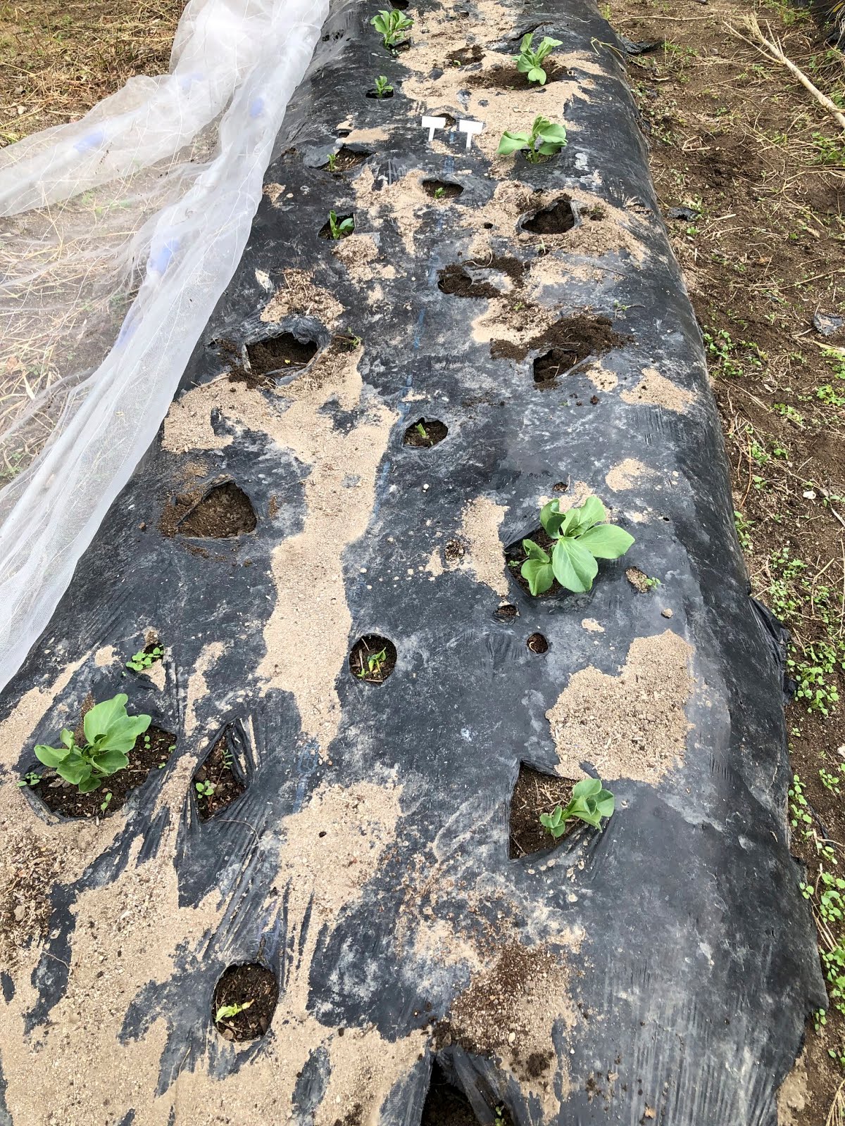 また、出てきた芽は防虫ネットのベタ掛けで圧迫されないように、今回は防虫ネットを低めのトンネルにした。