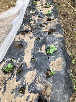 この畝のマルチは使い古しを使ったので、マルチの下にいた虫が悪さをしたのだろうか?