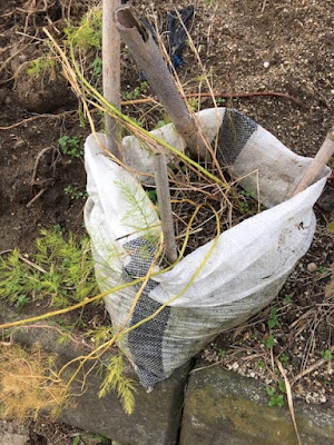 一方土嚢袋には、昨年の早春に種を蒔いた1年目のアスパラがある。