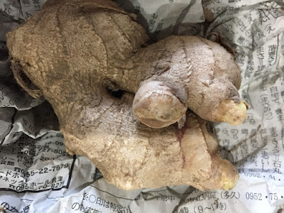 | よく見ると、縮んでないショウガにはすこし芽が出始めている。 これらのショウガも種ショウガとして使おう。 |