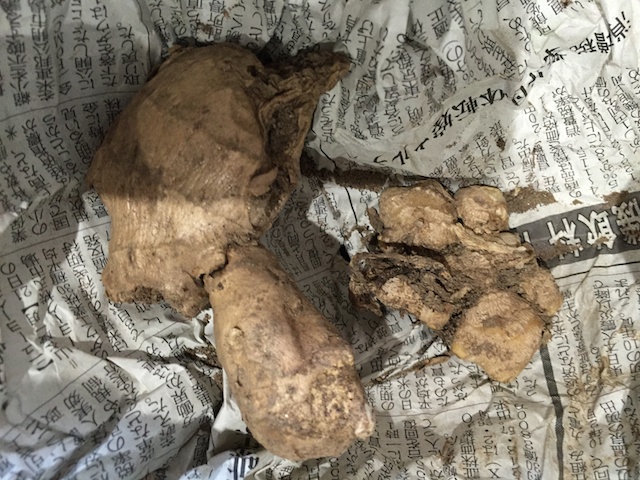 | この中にも、新聞紙に包んだショウガがある。 |