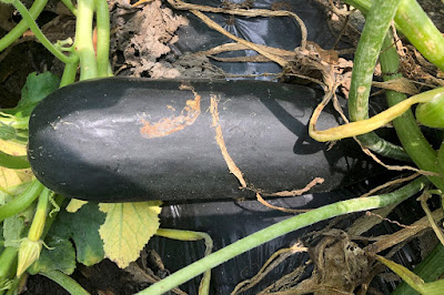 | こちらは緑ズッキーニだが、黒々とした色になってきた。 |