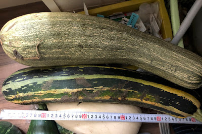 | 黄緑ズッキーニの50cmというのは初めて。 シマシマタイプは去年も50cmを記録した。 同じくらいの長さのシマシマタイプは畑に数個転がっているので記録更新に期待だ。 |