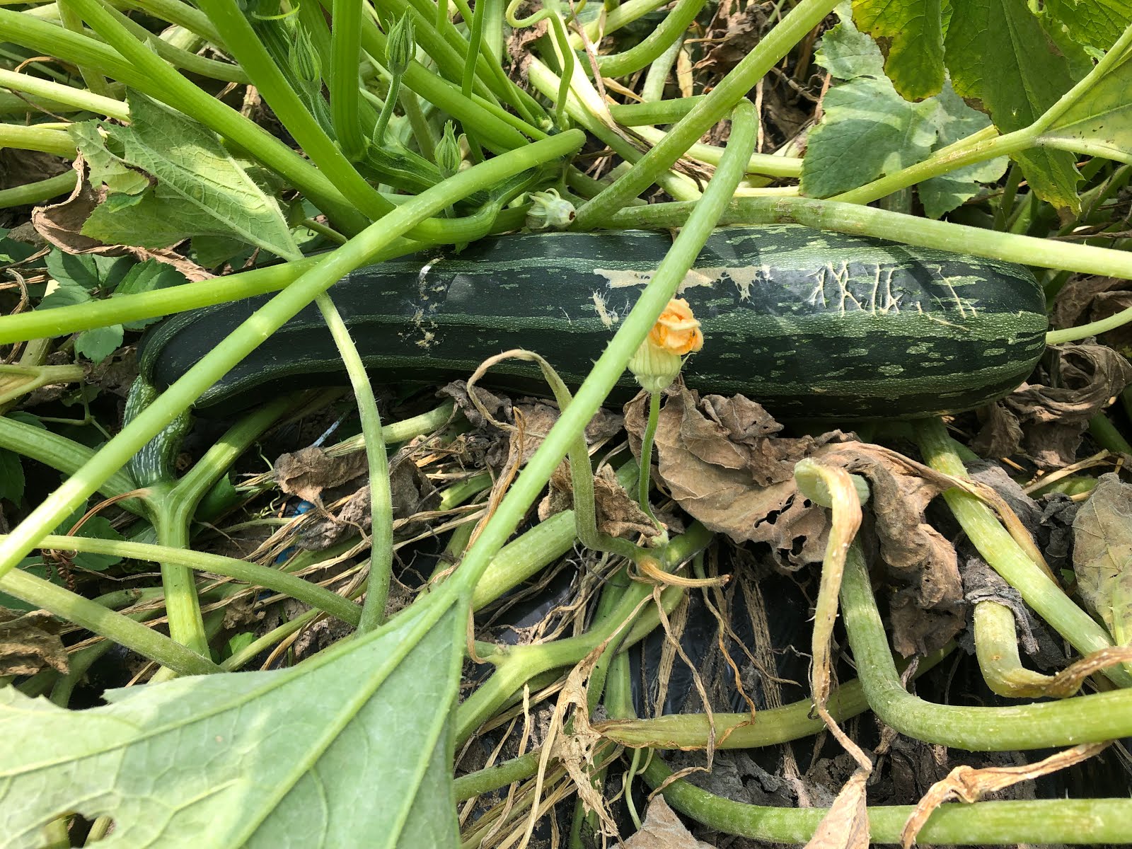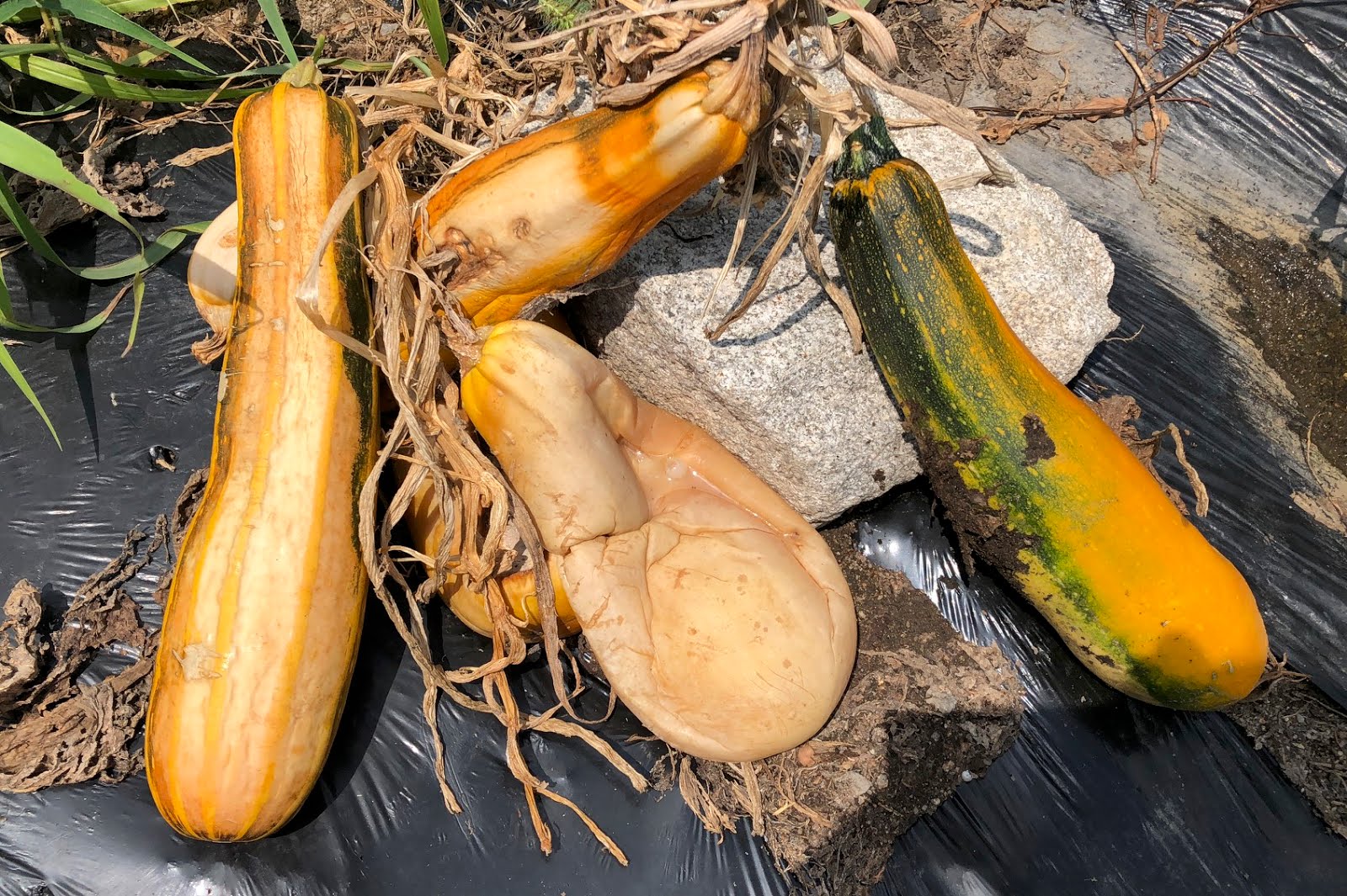 | こちらは実際去年の7月の終わり頃の写真。 種取り目的で畑に置きっぱなしにしていたズッキーニの多くは腐った。 |