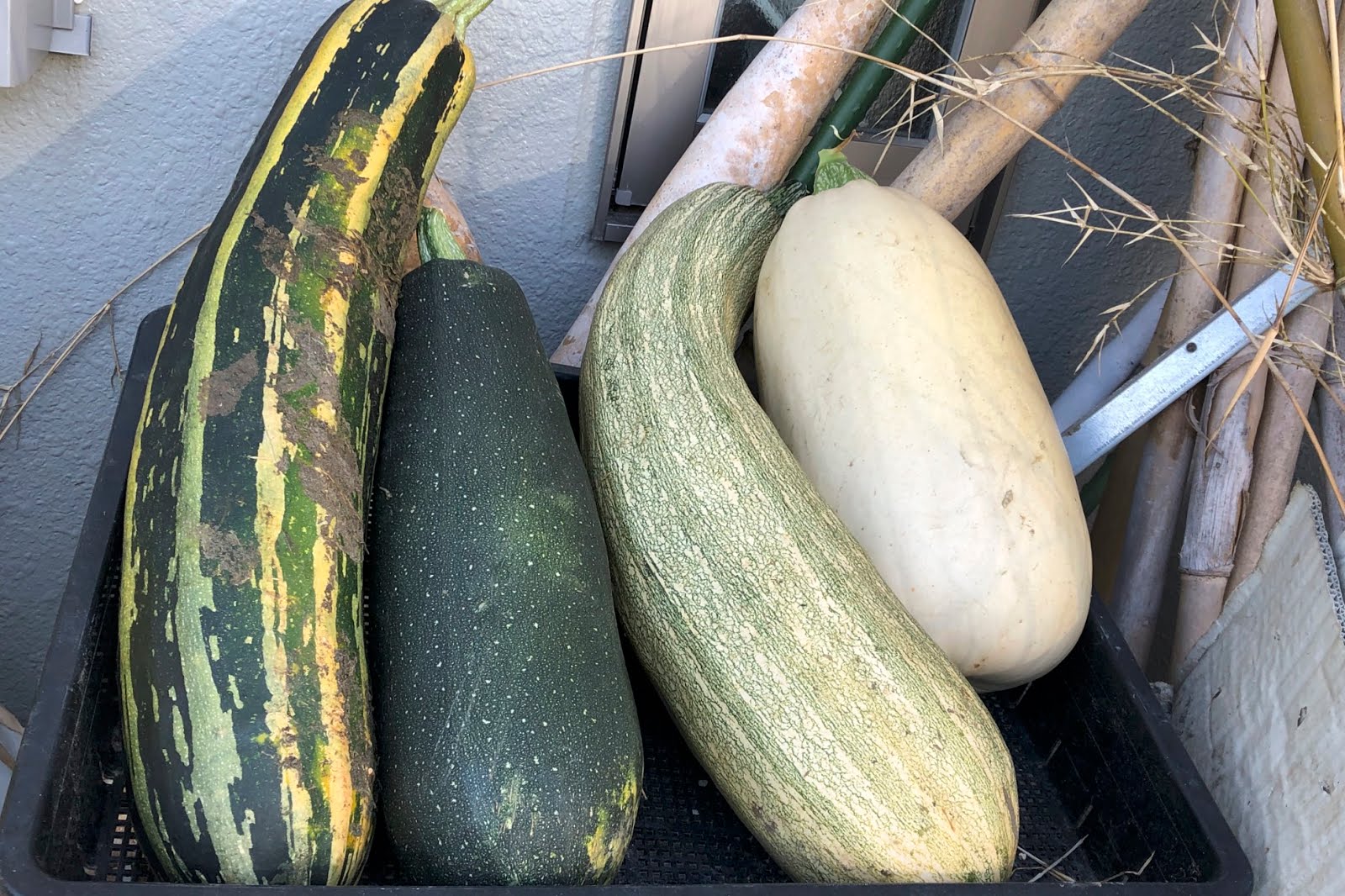 | ちなみに、こちらは去年7月後半に種取り用に収穫した時の写真。 こんなズッキーニが全て種取りになると嬉しいのだが。。 |