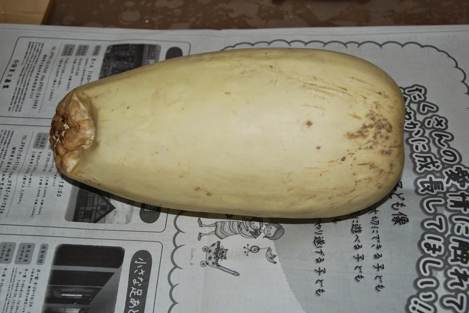| 収穫し損なって大きくなった白ズッキーニ。 写真では分かりにくいが大きさは30cm以上ある。 種取り用に畑に置きっ放しの実以外にもこんな実が3個転がっている。 これらは種取り失敗時の予備の種取り用だ。 |