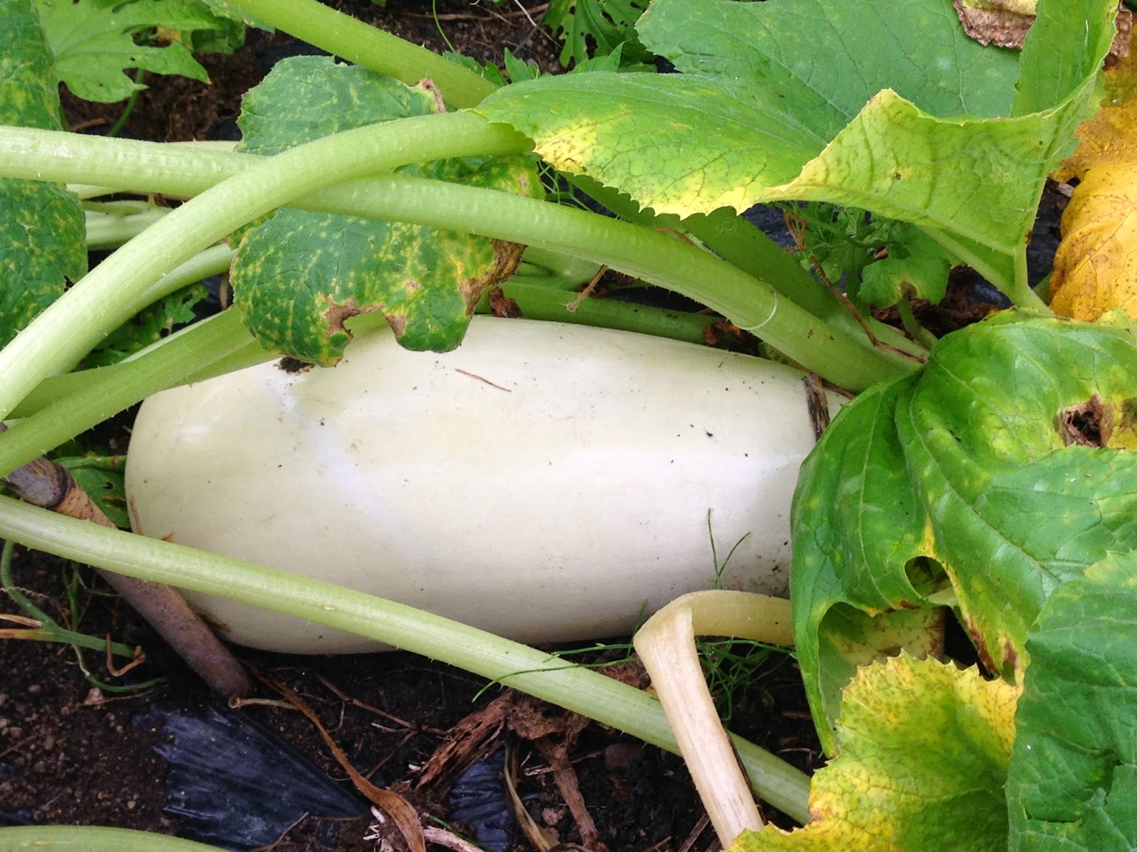 | 収穫し損なって大きくなった白ズッキーニ。 写真では分かりにくいが大きさは30cm以上ある。 種取り用に畑に置きっ放しの実以外にもこんな実が3個転がっている。 これらは種取り失敗時の予備の種取り用だ。 |