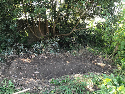で、今日はまず種芋植え付け場所を、確保するために木陰のスペースで、雑草やキクイモの苗などを片付けて植え付け場所を確保することにした。