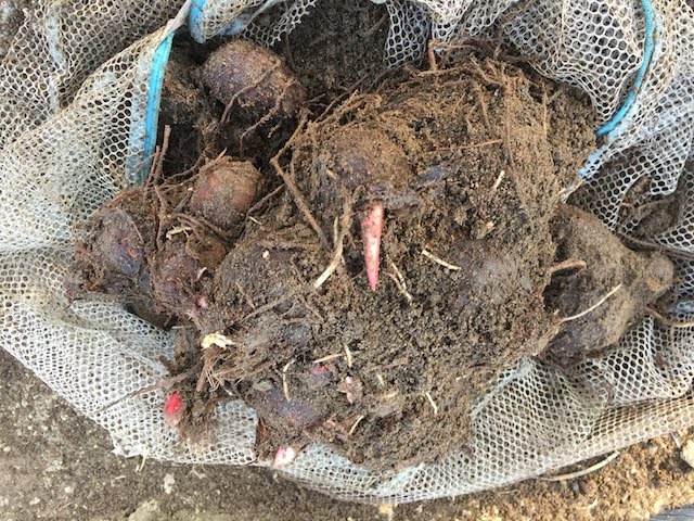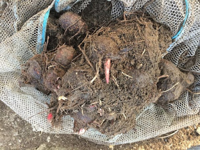 昨年12月、下の写真のランドリーネットの中に、親芋、小芋に土も根も付いた状態のものを逆さに入れていった。