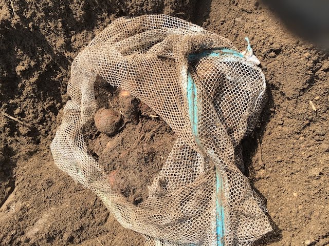 ランドリーネットが一部でも見えてきたら、あとは鍬を入れるのをやめて、ネット掴んで無理やり引きずり出すのだ。