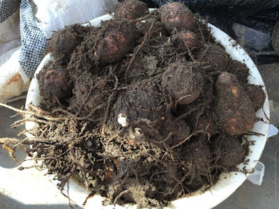 さらに、今年初めてのチャレンジとしては、今日収穫した小芋を、いくつか残っているヤーコンとともに、容器に土を被せた状態で置いてみた。
