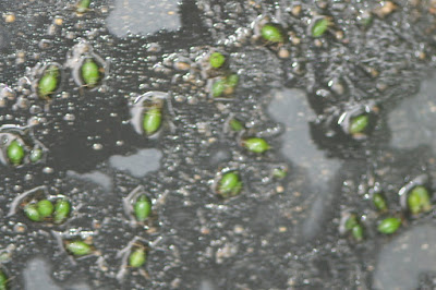 苗の先端部分に集団でいるアブラムシは、そこに集中的に噴霧すると、ボロボロ落ちてその下の方の葉には落ちた大量のアブラムシが見える。