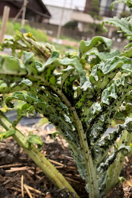 | こちらはアブラムシがビッシリの苗の先端。 アブラムシはカメムシに近い昆虫で、柔らかい葉っぱから液を吸っているのだ。 |