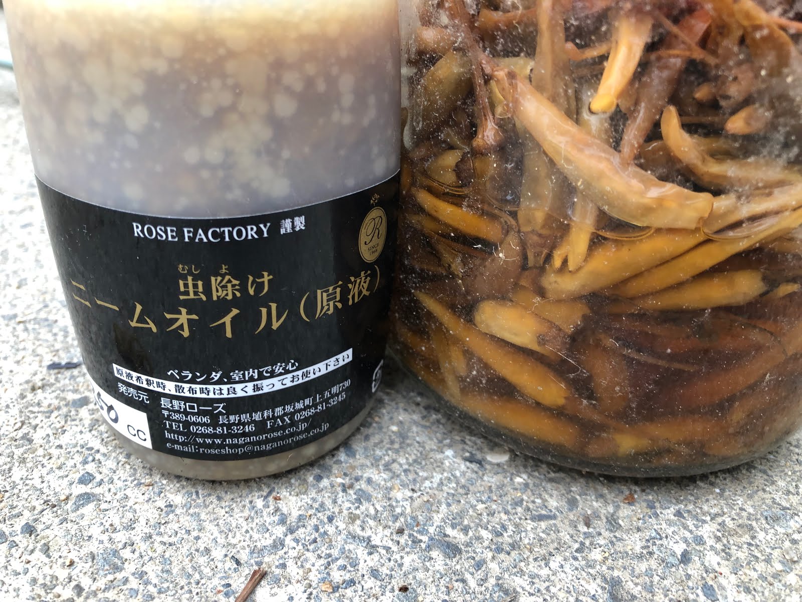 今日の噴霧でトウガラシ焼酎液は使い切ってしまったが、ニームオイルは希釈して使うのでまだ大量に残っている。